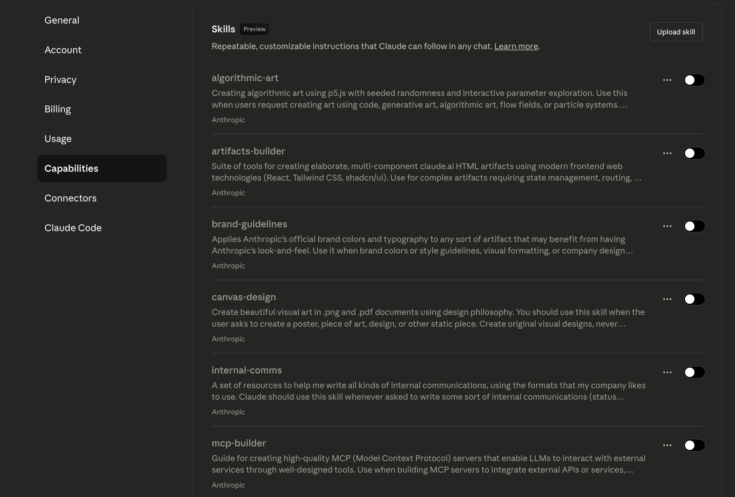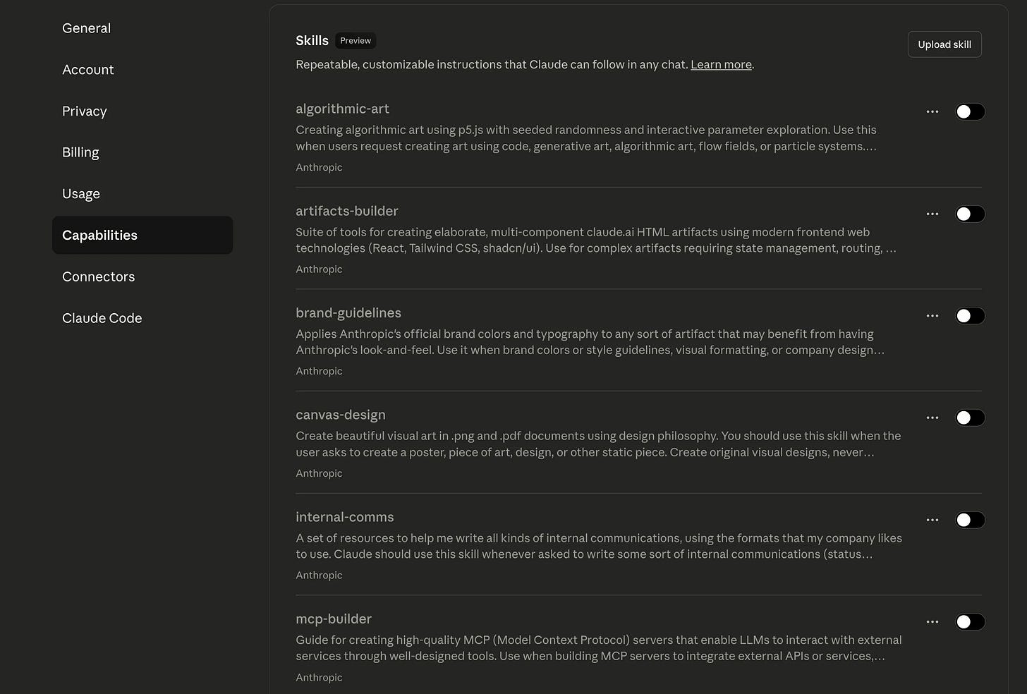 The second screenshot shows the Skills interface in Claude’s settings, where you can see multiple active skills ready to be deployed: algorithmic-art, artifacts-builder, brand-guidelines, internal-comms, canvas-design. Each one represents a workflow that can be used repeatedly.