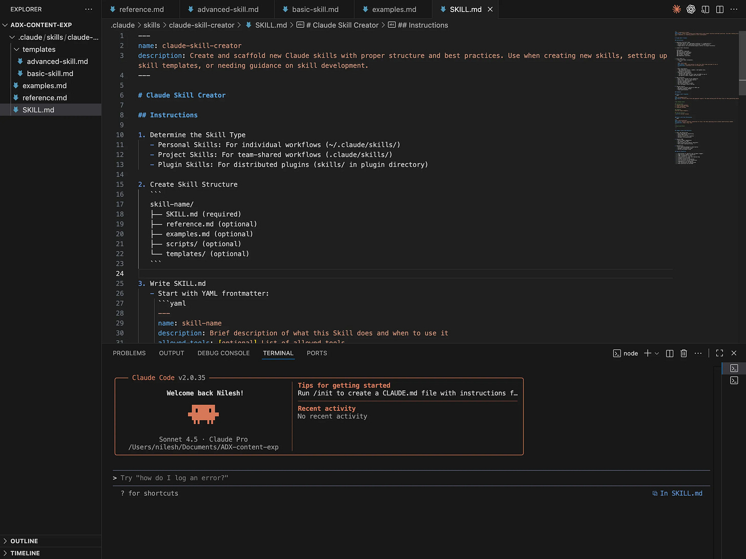 The first screenshot above shows a skill template structure in VS Code—clean, organized, version-controlled.