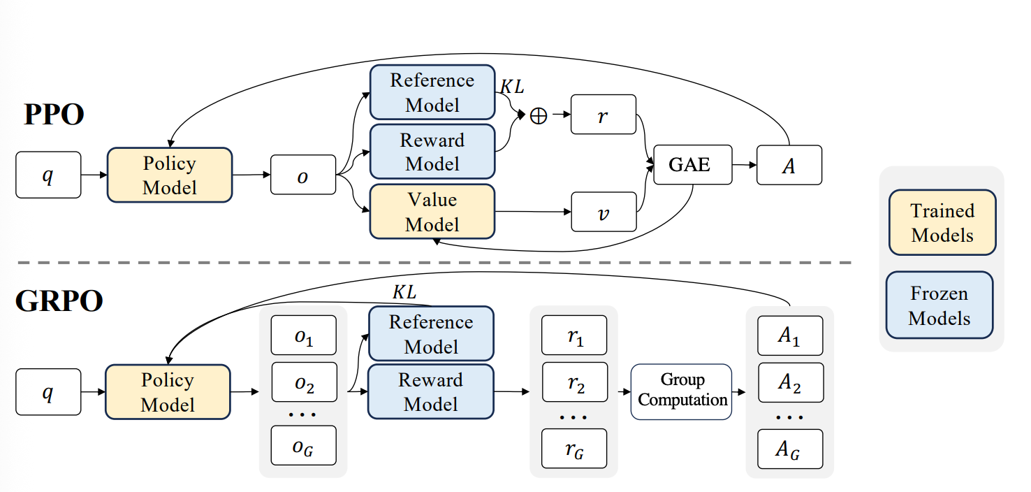 The reward signal is then used to update the LLM using algorithms like PPO or GRPO.