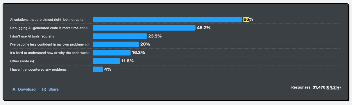 The 2025 Stack Overflow survey quantified the problem. 66% of developers report frustration with “AI solutions that are almost right”—code that compiles but requires significant rework. The debugging paradox compounds this: 45% say debugging AI-generated code takes longer than writing it themselves.