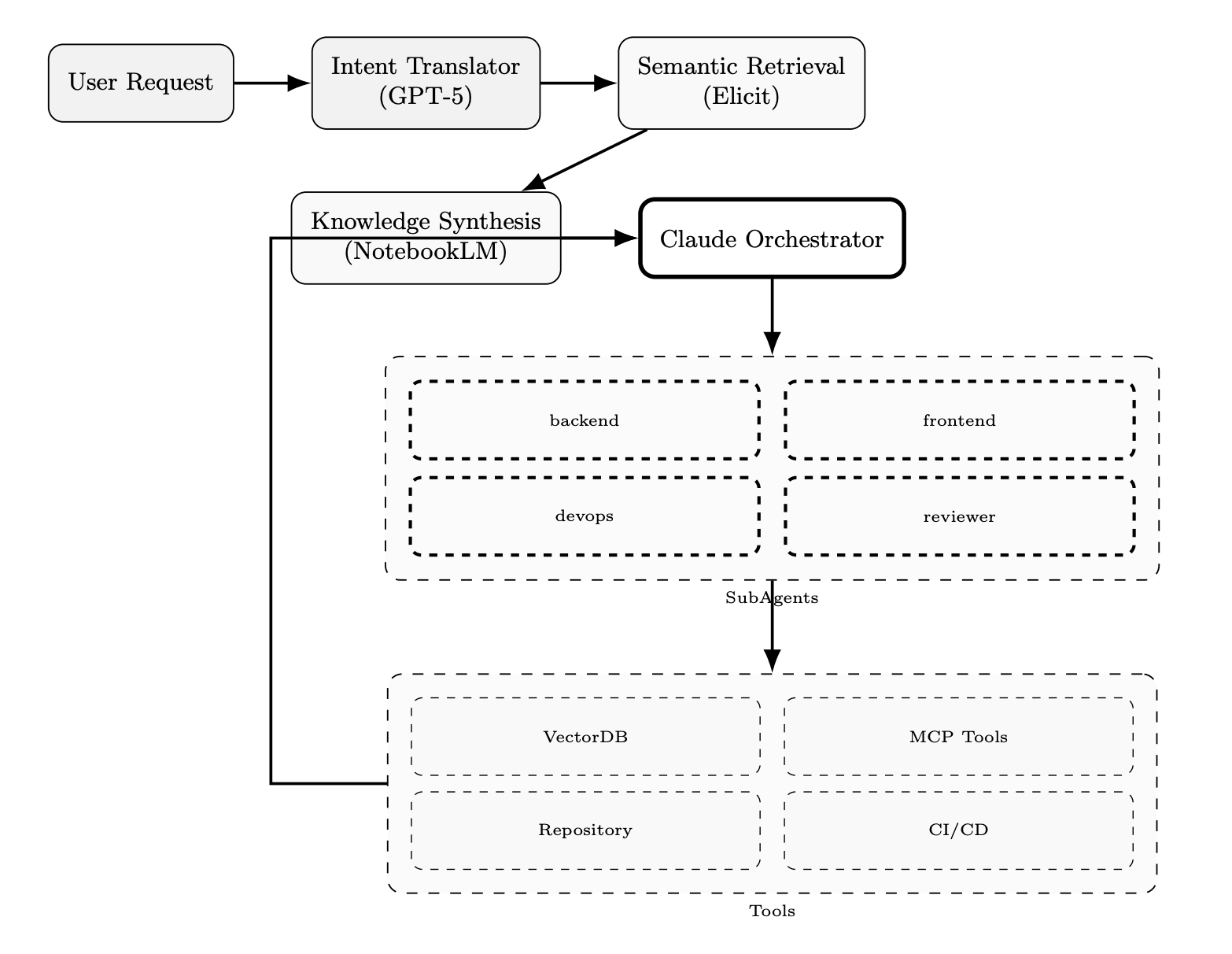 Intent Translation (GPT-5): Vague or underspecified inputs are rewritten into structured task specs—goals, constraints, file targets, and evaluation rules..