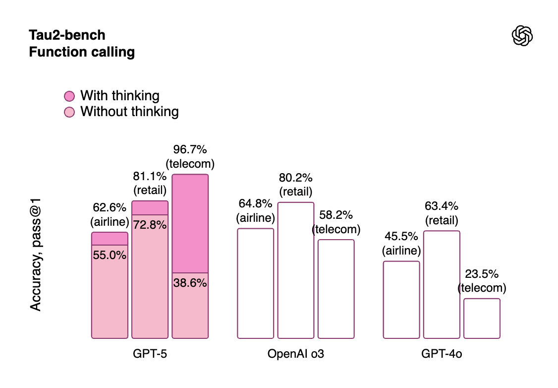 Some benchmarks highlight why these gains matter in practice. On Tau2-bench, which tests complex tool use, GPT-5 reached 96.7%, showing its reliability in chaining multiple steps and recovering from errors.