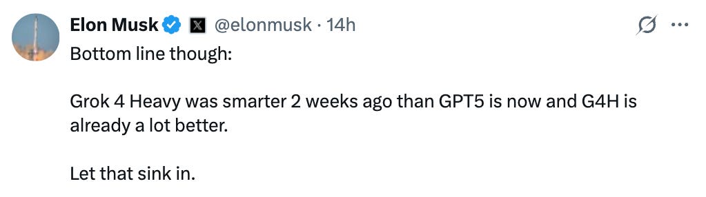 “Grok 4 Heavy was smarter 2 weeks ago than GPT5 is now…”