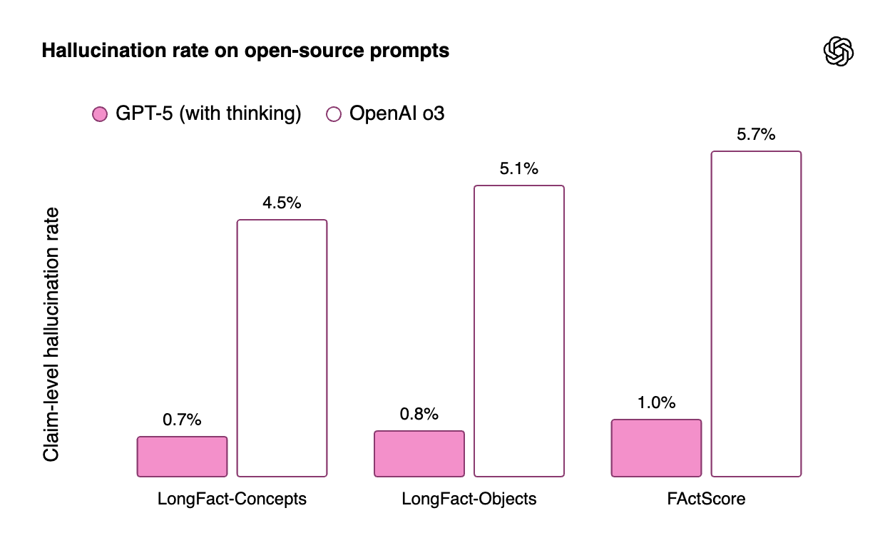 GPT-5’s improvements are not just visible in demos; they show up in the numbers that matter for day-to-day work. One of the most significant is hallucination reduction.