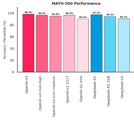 MATH-500 performance: Assesses advanced mathematical reasoning through diverse problems, including proofs, equations, and multi-step calculations. It emphasizes accuracy and the model’s ability to follow a logical progression through complex tasks.