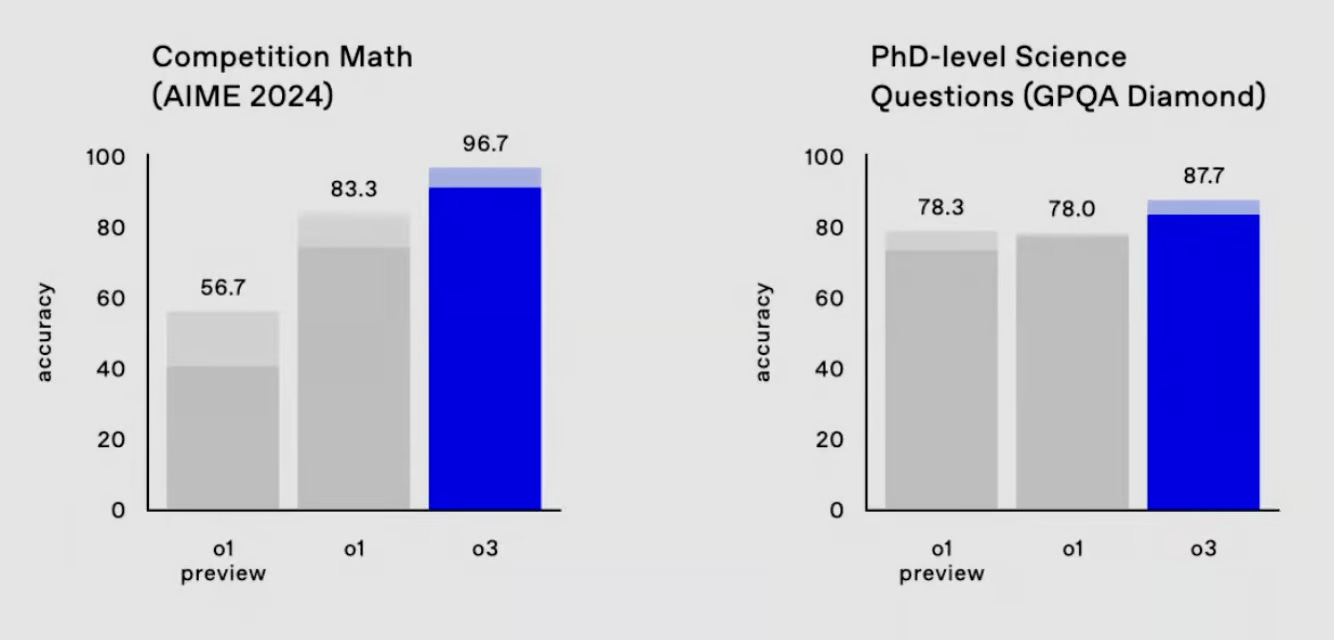 Graph showing the leap of o3 over its predecessor o1 in Competition Math and PhD-level Science | Source: OpenAI