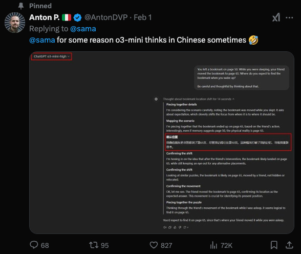 Tweet from Anton P on X about mixing language while reasoning | Source: X