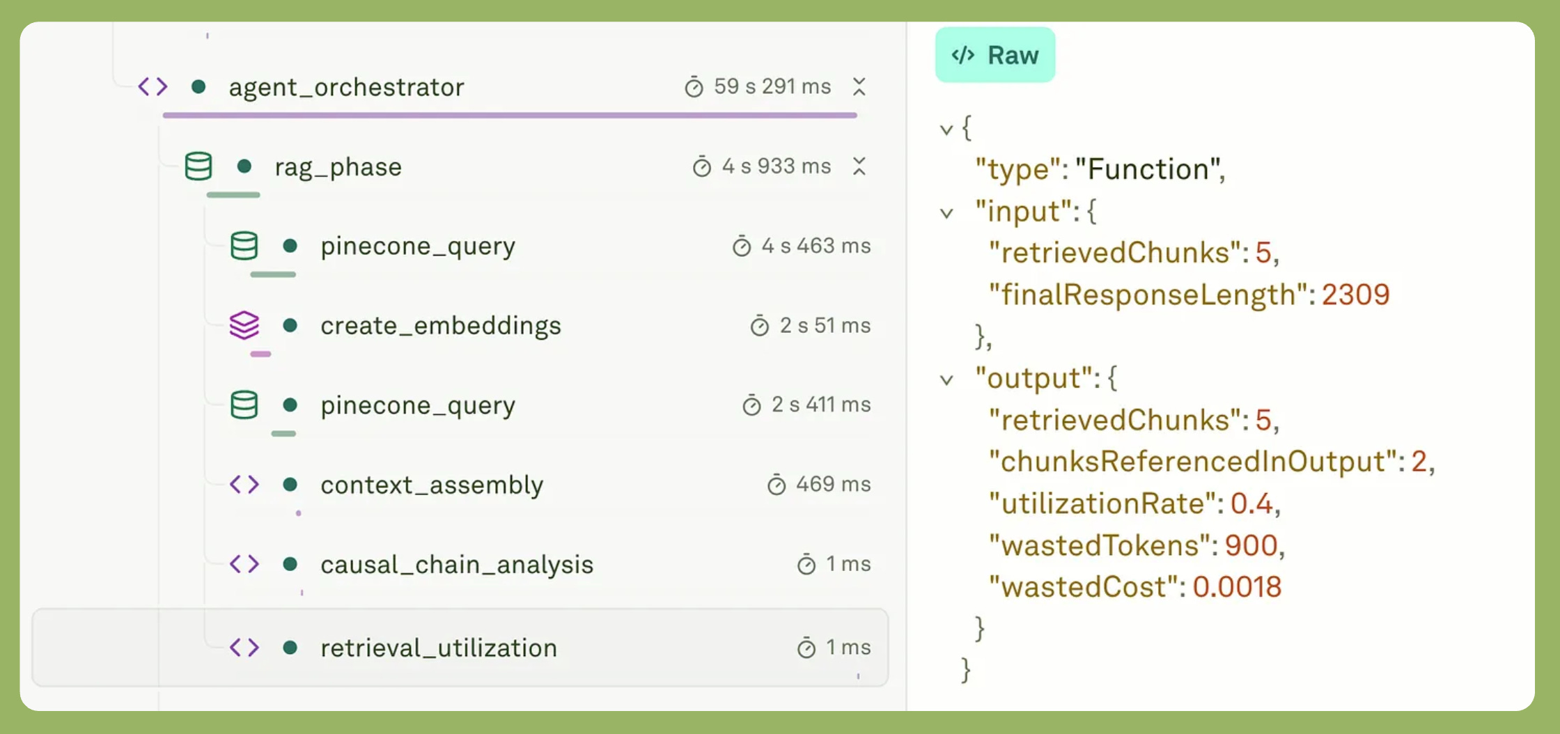 Low utilization means your retrieval returns noise. Fix the query expansion. Adjust the similarity threshold. Reduce top-k. Without observability, you’d never know this was happening.