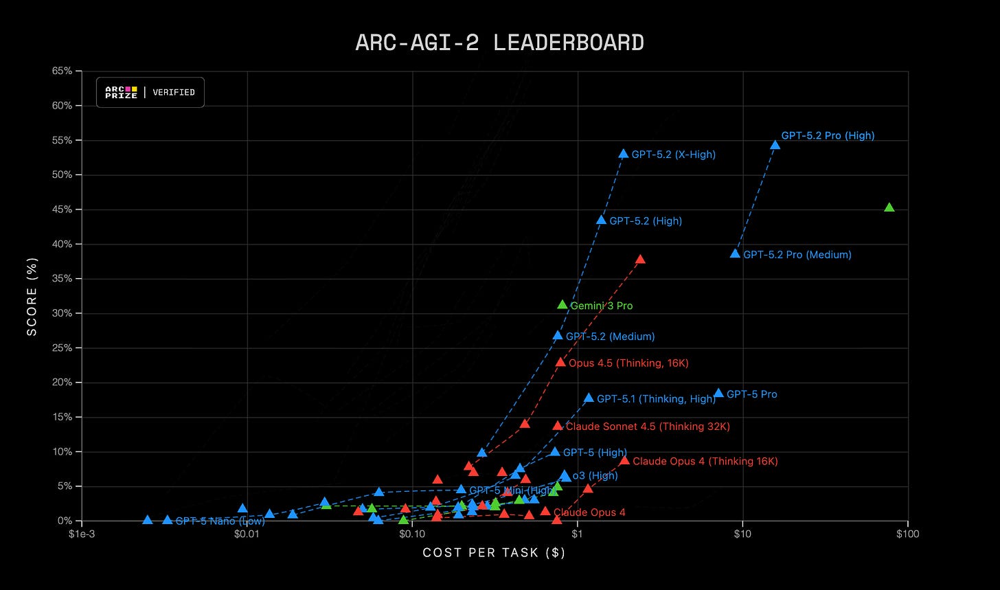 At the time when GPT-5 was released on August 7, it achieved a score of 18.3%, but within a span of four months, GPT-5.2 Pro (High) achieved the highest score of 54.2%.