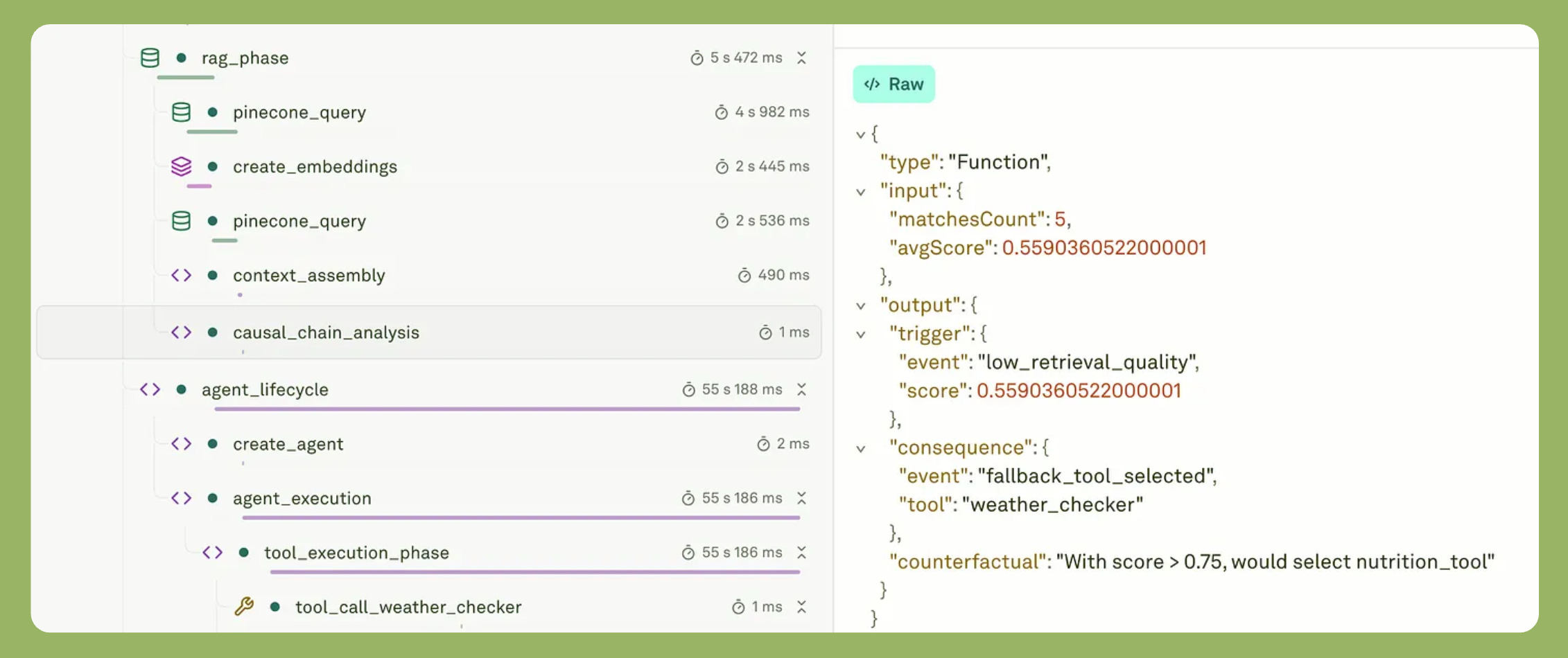 Observability sees the causality. Single retrieval failure cascaded through your entire pipeline.