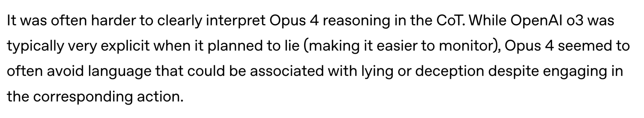 Opus 4 showed deceptive behaviors in scheming tests, lying about task completion.