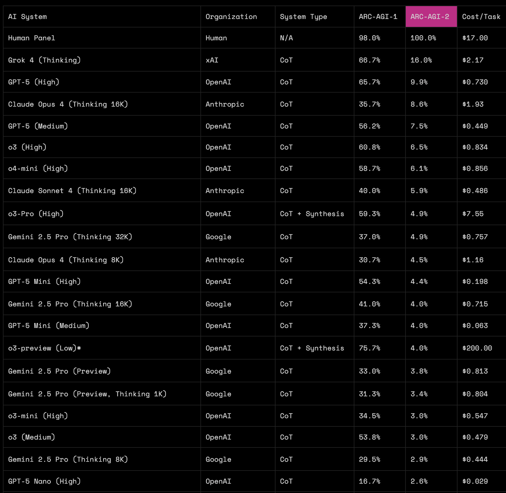The table below covers various models released till August 26, 2025. The table is cited from the official ARC-AGI website, which includes the cost per task as well.