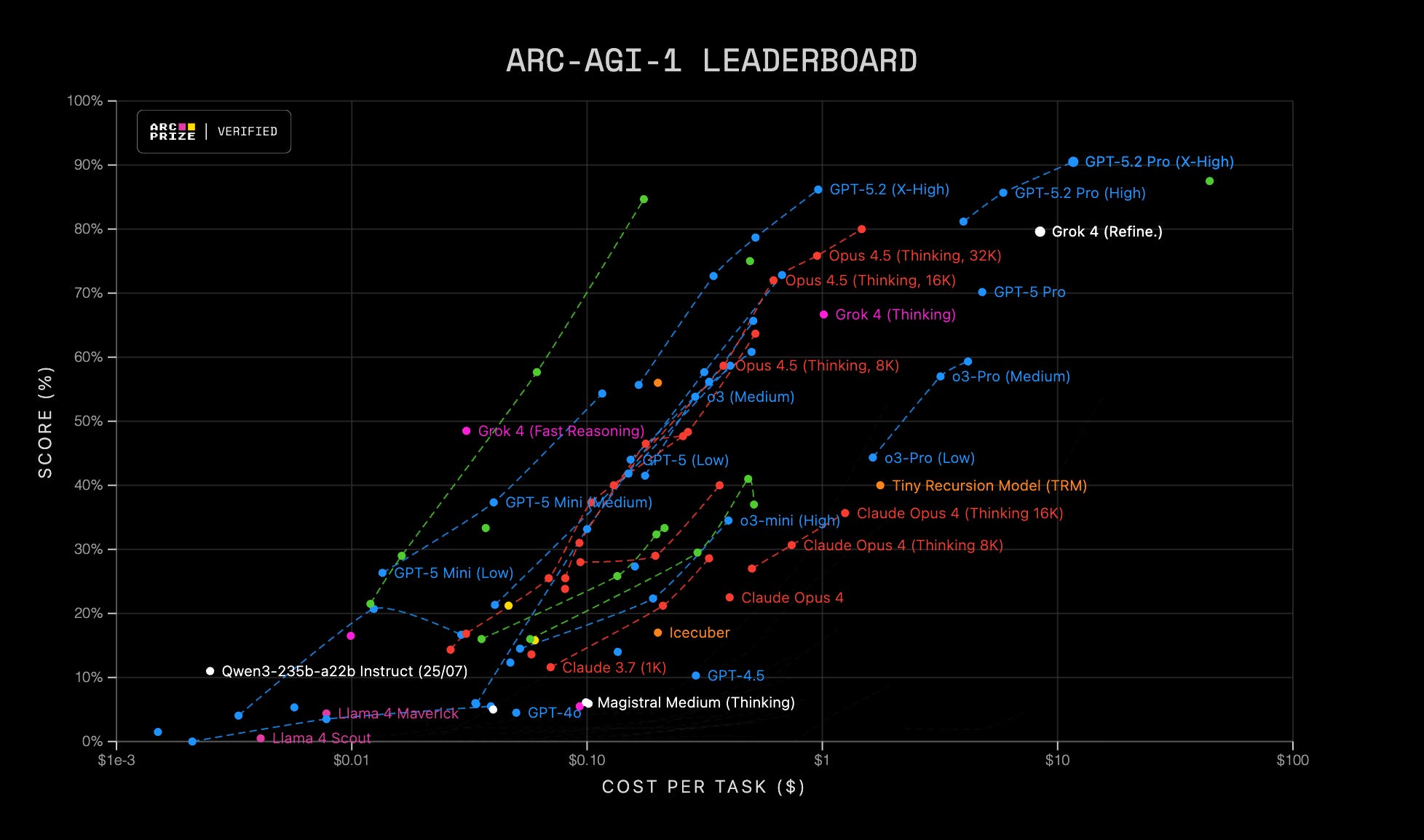 This is what ARC has become: not a pass/fail IQ test for frontier models, but a stress test for generalization under resource constraints. A way to measure whether a system can acquire new reasoning procedures without over-relying on pretraining artifacts or excessive post hoc search.