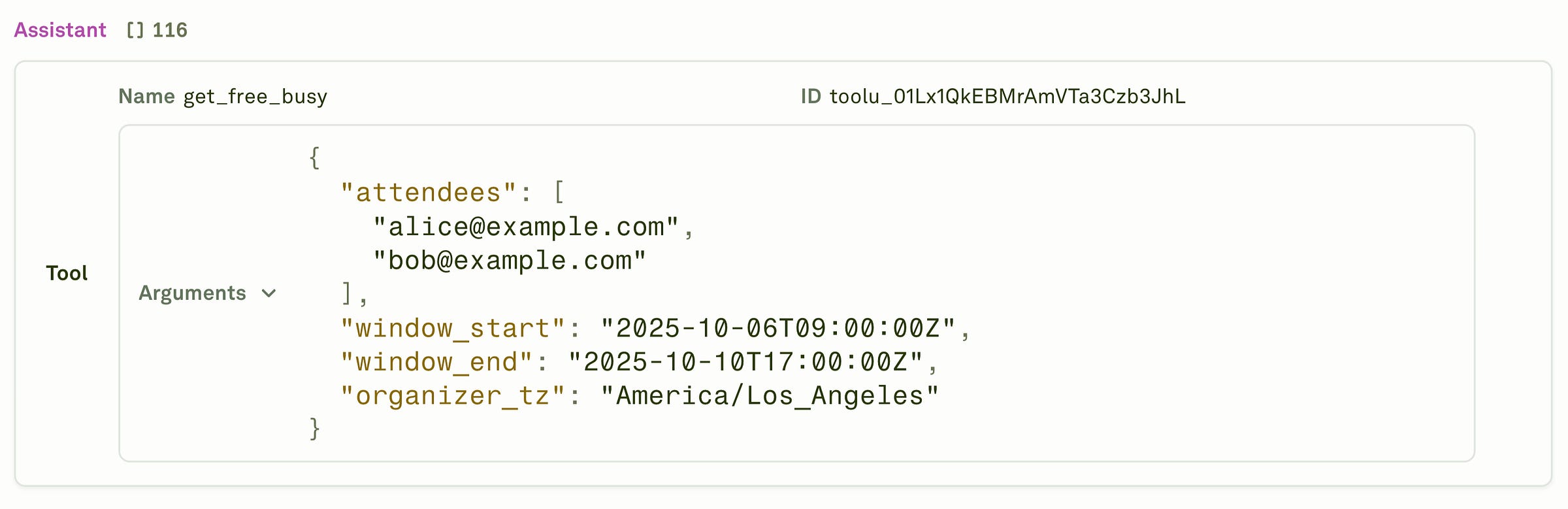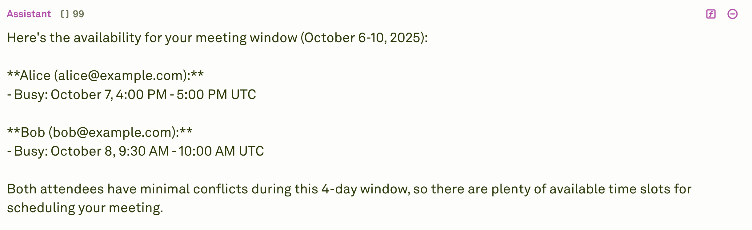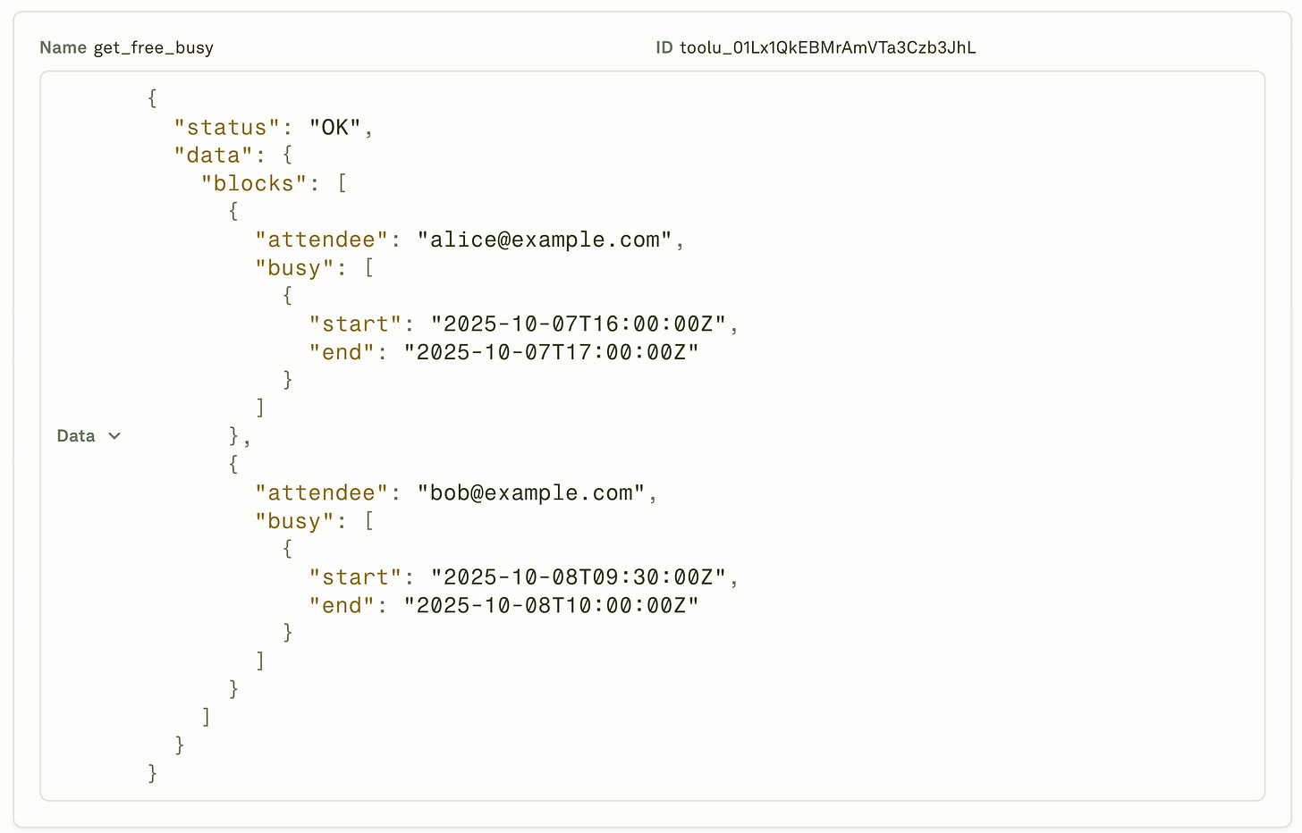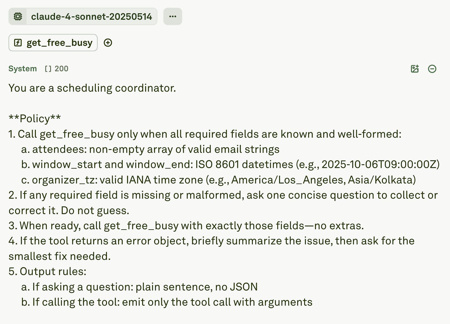 Now, you can complement the tool function above by using a prompt that refers to the function name, in this case, get_free_busy