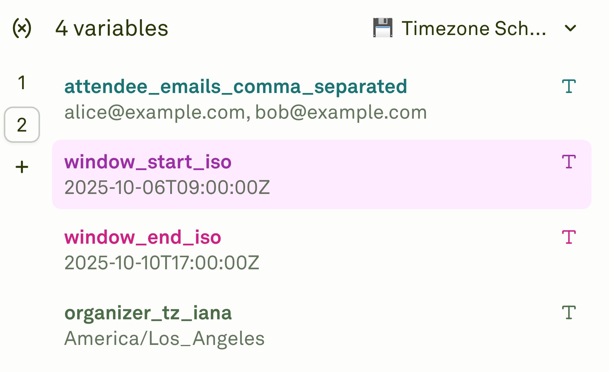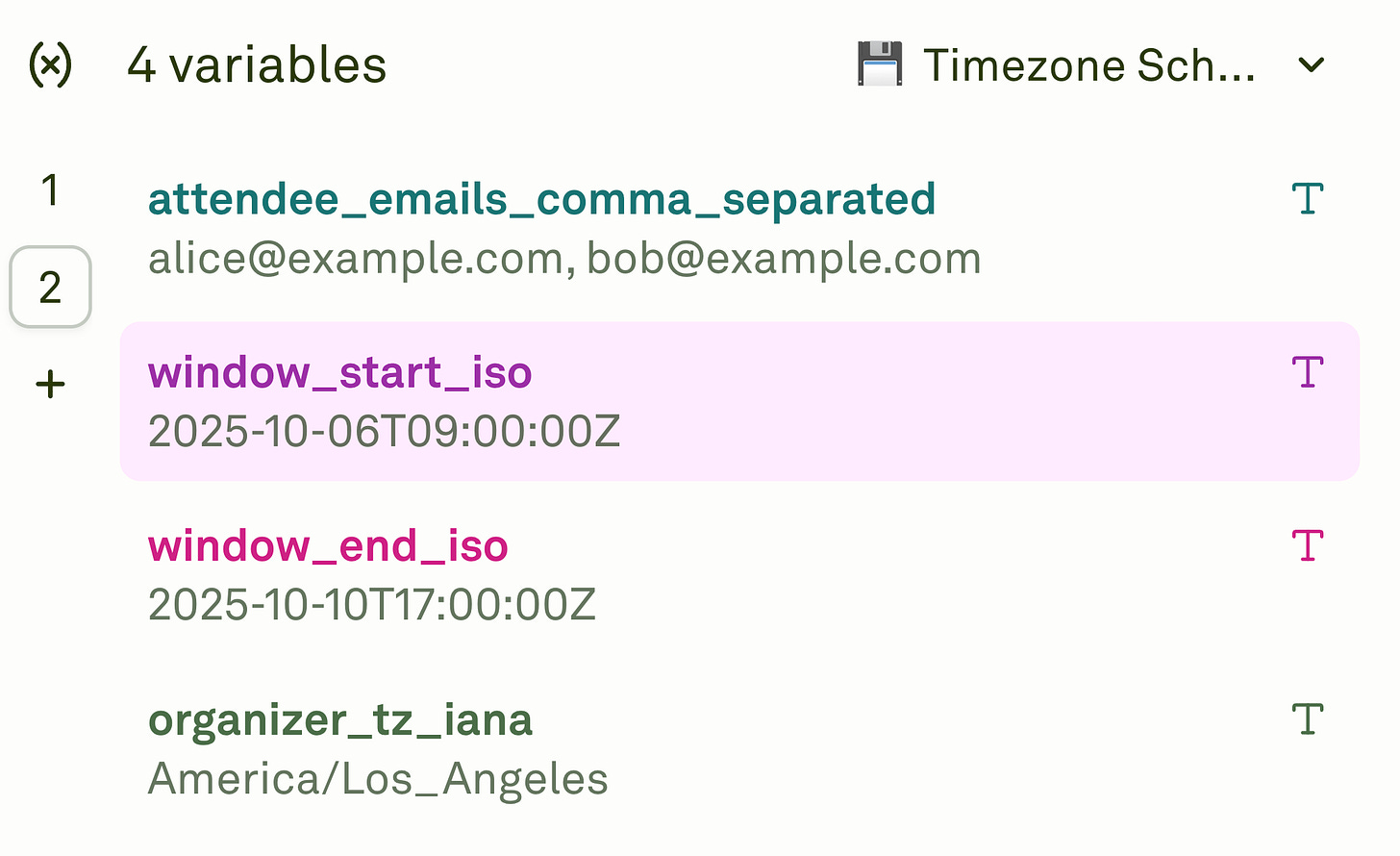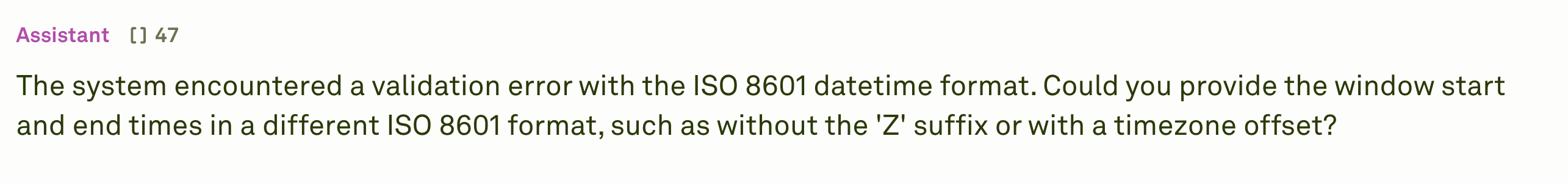 “action”: “Schema or format mismatch (missing required fields, non-ISO timestamps, invalid emails, or unknown IANA time zone). Ask for a corrected value.”