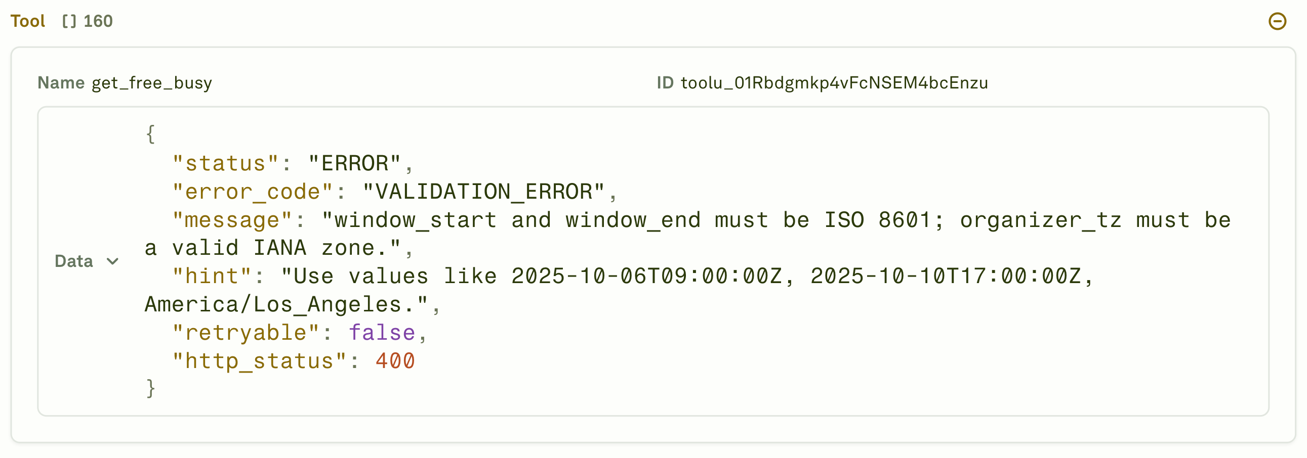 VALIDATION_ERROR: Schema or format mismatch, such as missing required fields, non-ISO timestamps, invalid emails, or unknown IANA time zone, must return 400 error. Mark them retryable=false, and ask for a corrected value.