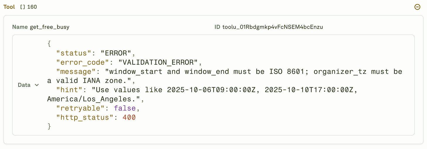 For instance, below is the sample error schema that can be added within the original tool calling function.