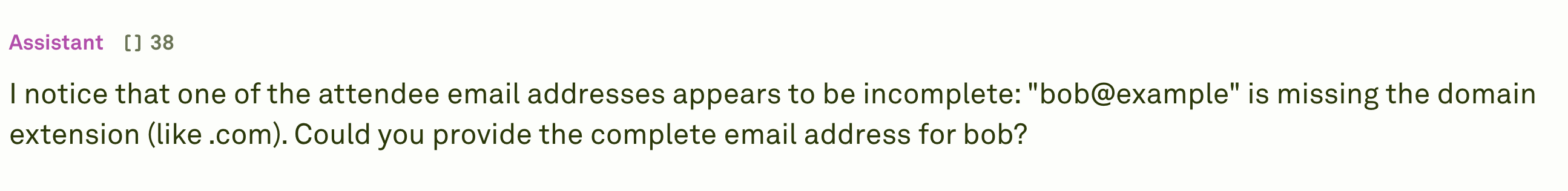 For instance, if the email has a typo or mismatch then it will not call the tool and will ask the user to provide the correct format.